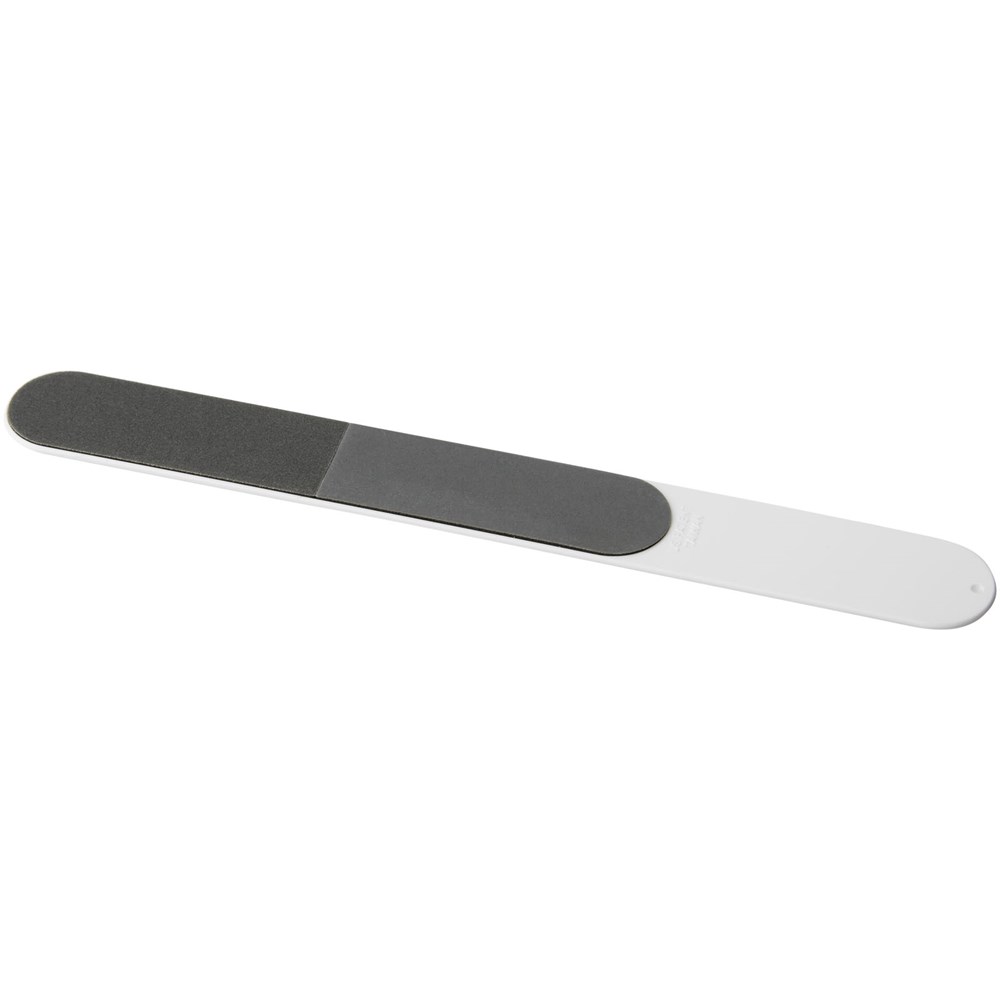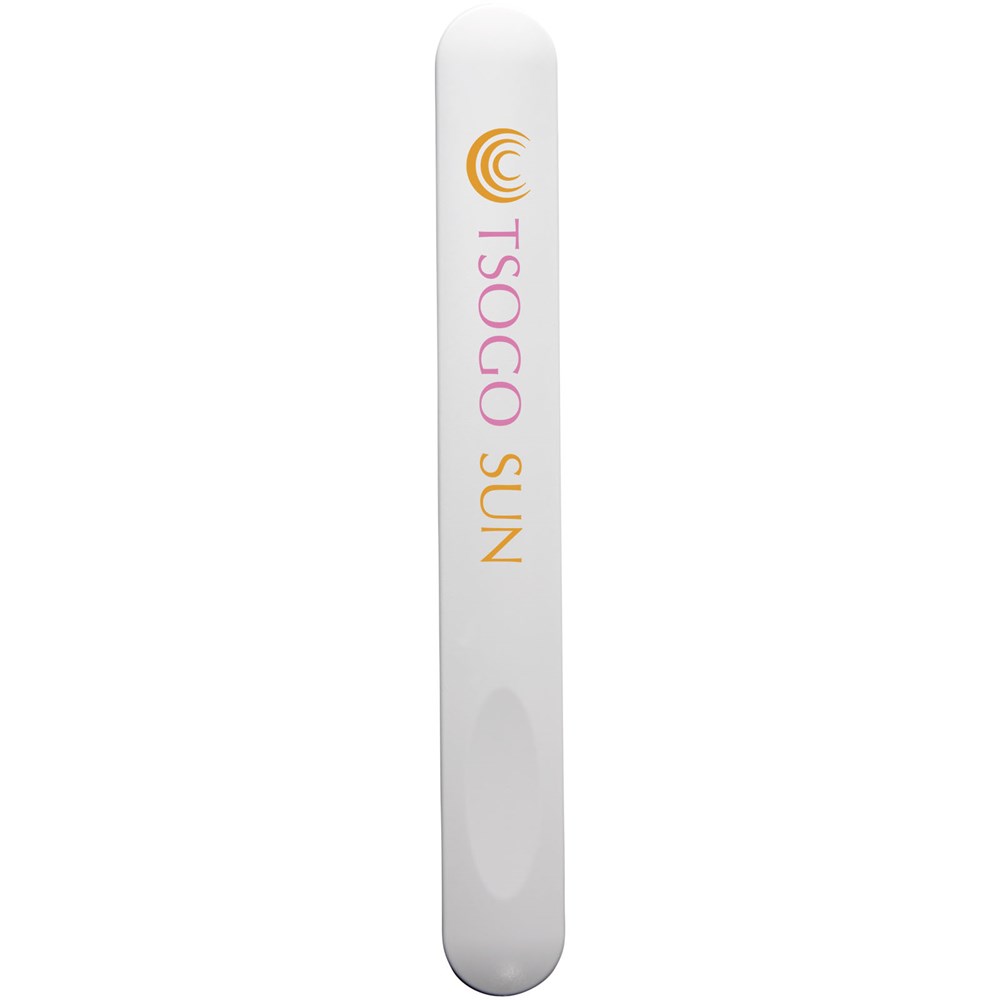 Een handig promotie item voor in handtassen. Nagelvijl met ruimte voor een logo aan de achterzijde. Opgeborgen in een doorzichtige beschermhoes.