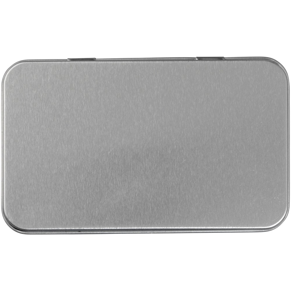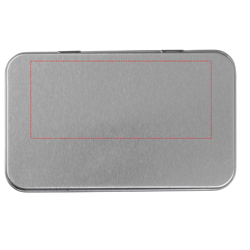 Een handige tinnen doos met vouwdeksel met 12 EHBO-benodigdheden. Zeer geschikt voor thuis, in de auto of op het werk, en met een groot decoratievlak op het deksel. Een EHBO-koffer wordt beschouwd als een medisch hulpmiddel en is onderworpen aan 93/42/EEG, op basis van het beoogde gebruik: "diagnose, preventie, controle, behandeling of verlichting van ziekte". Dit medisch hulpmiddel is van KLASSE I, Is.