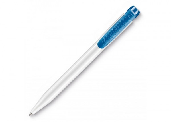Pennen kunnen grote boosdoeners zijn in het verspreiden van bacteriën. Deze pen is gecertificeerd volgens de ISO 22196 normering. Het is de promotionele pen voor bedrijven in de medische wereld en ook zeer geschikt voor bijvoorbeeld scholen, horeca en publieke instellingen. Deze IProtect pen komt met een witte barrel en een gekleurde clip. Bevat een X20 vulling met blauw schrijvende inkt. De pen heeft een drukmechaniek en is gemaakt van ABS kunststof met zink-ionen. Geproduceerd in Europa.