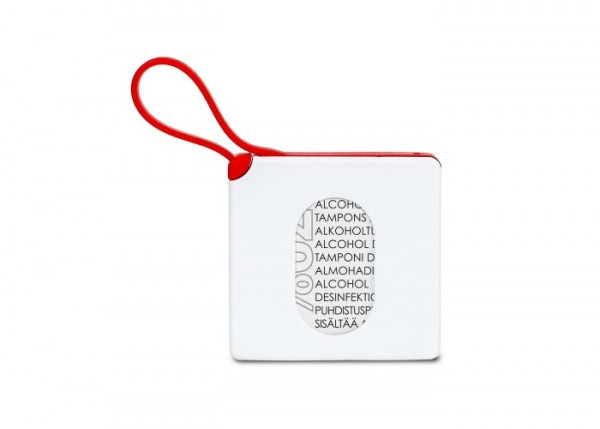 Compacte houder met 15 alcoholdoekjes (75% alcohol). De stevige houder beschermt de inhoud en kan nagevuld worden. De siliconen van sluit de houder af en kan ook gebruikt worden om het aan een tas of ander voorwerp te hangen.