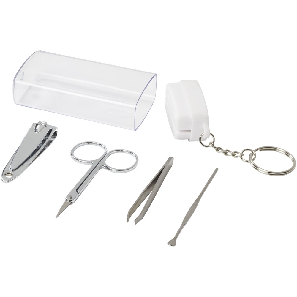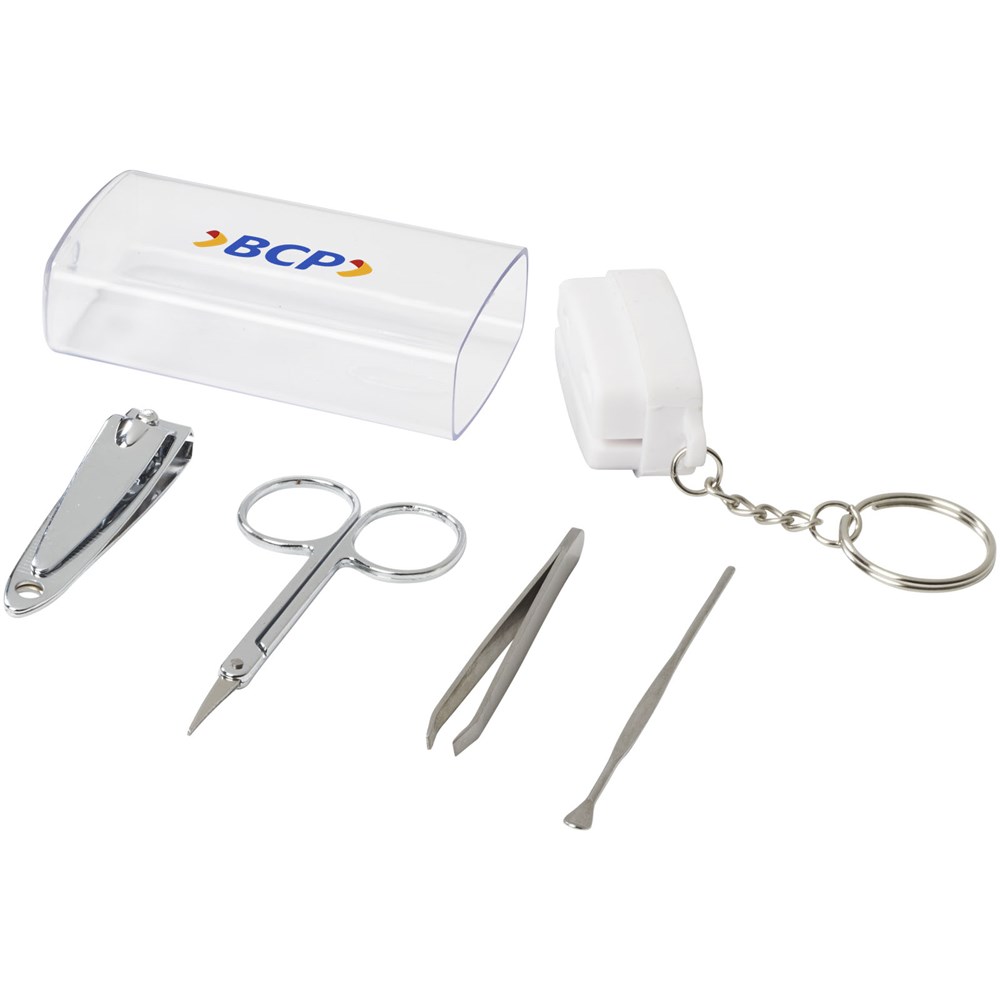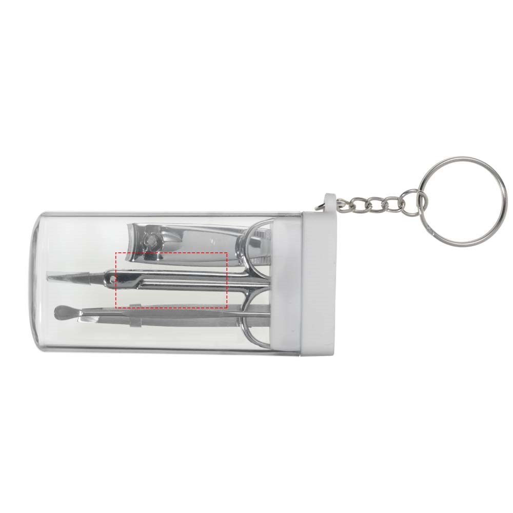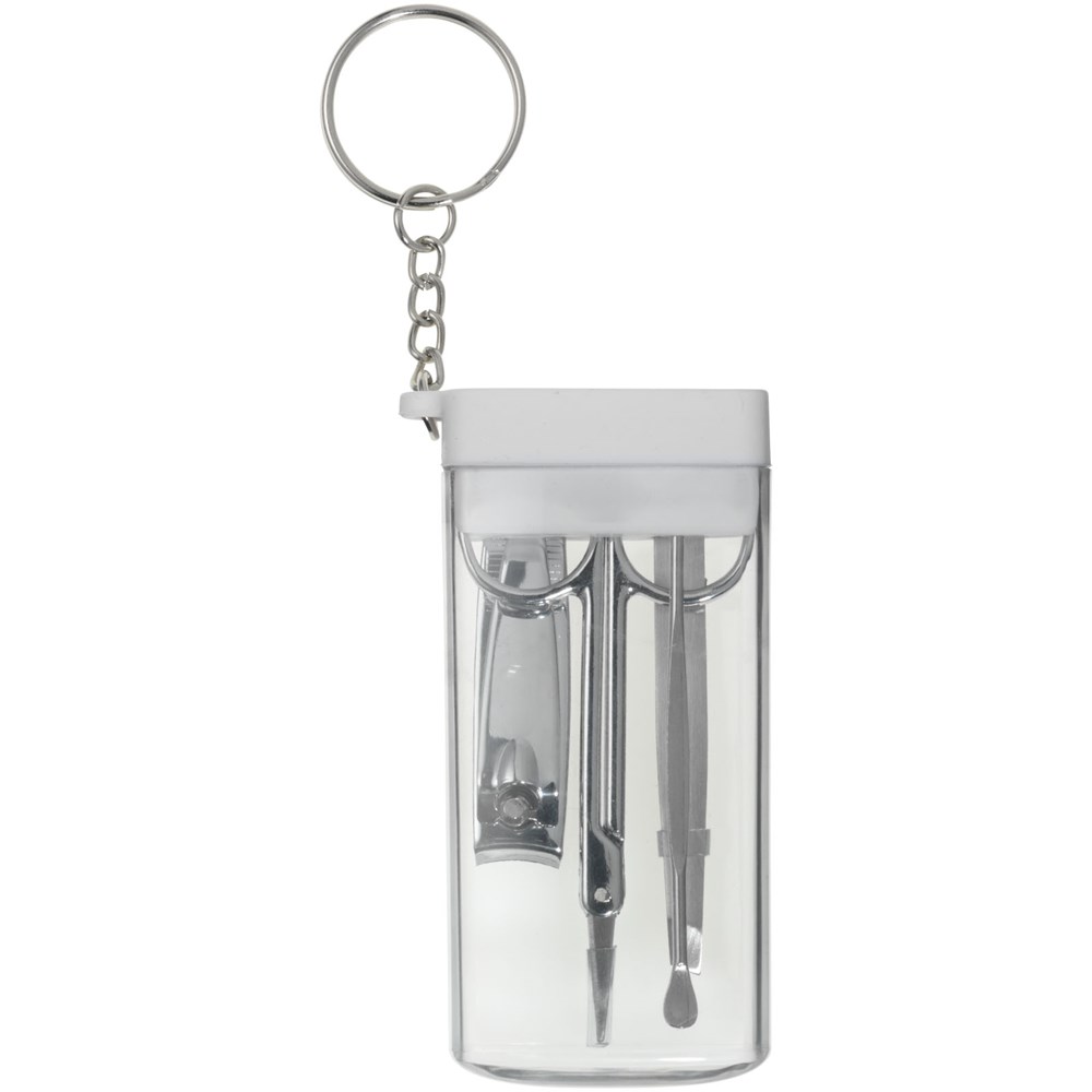 Trendy doos met sleutelhanger om het gemakkelijk te maken om de manicure set altijd bij je te hebben. Inclusief nagelschaar, pincet, gebogen schaar en nagelriem.