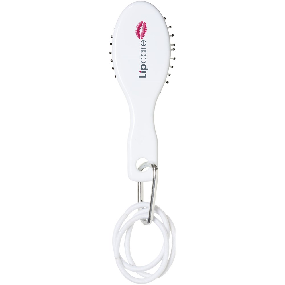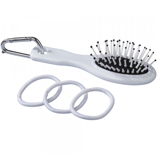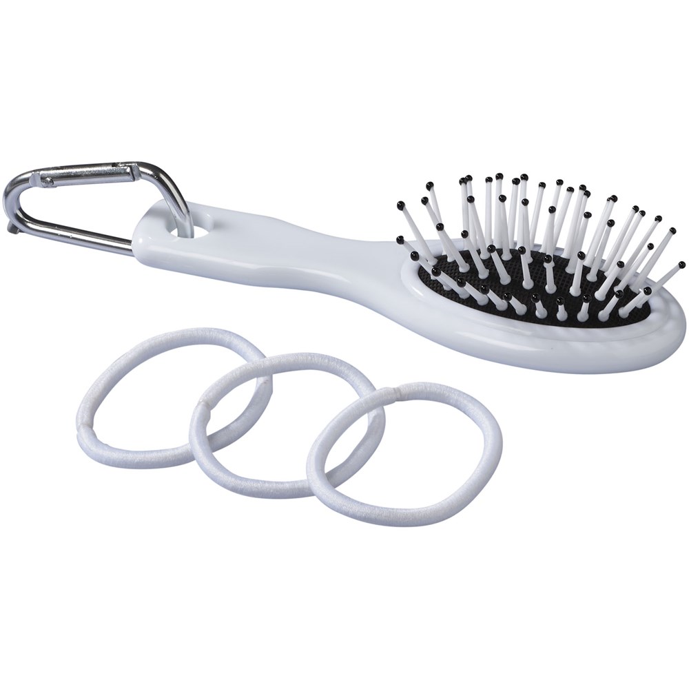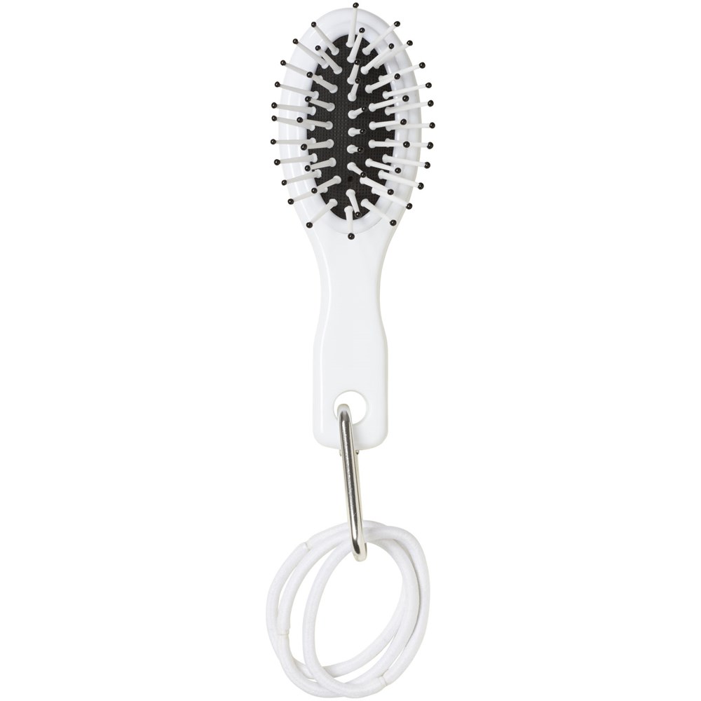 Een reismodel haarborstel, 3 haar elastiekjes en een mini aluminium karabijner.meer